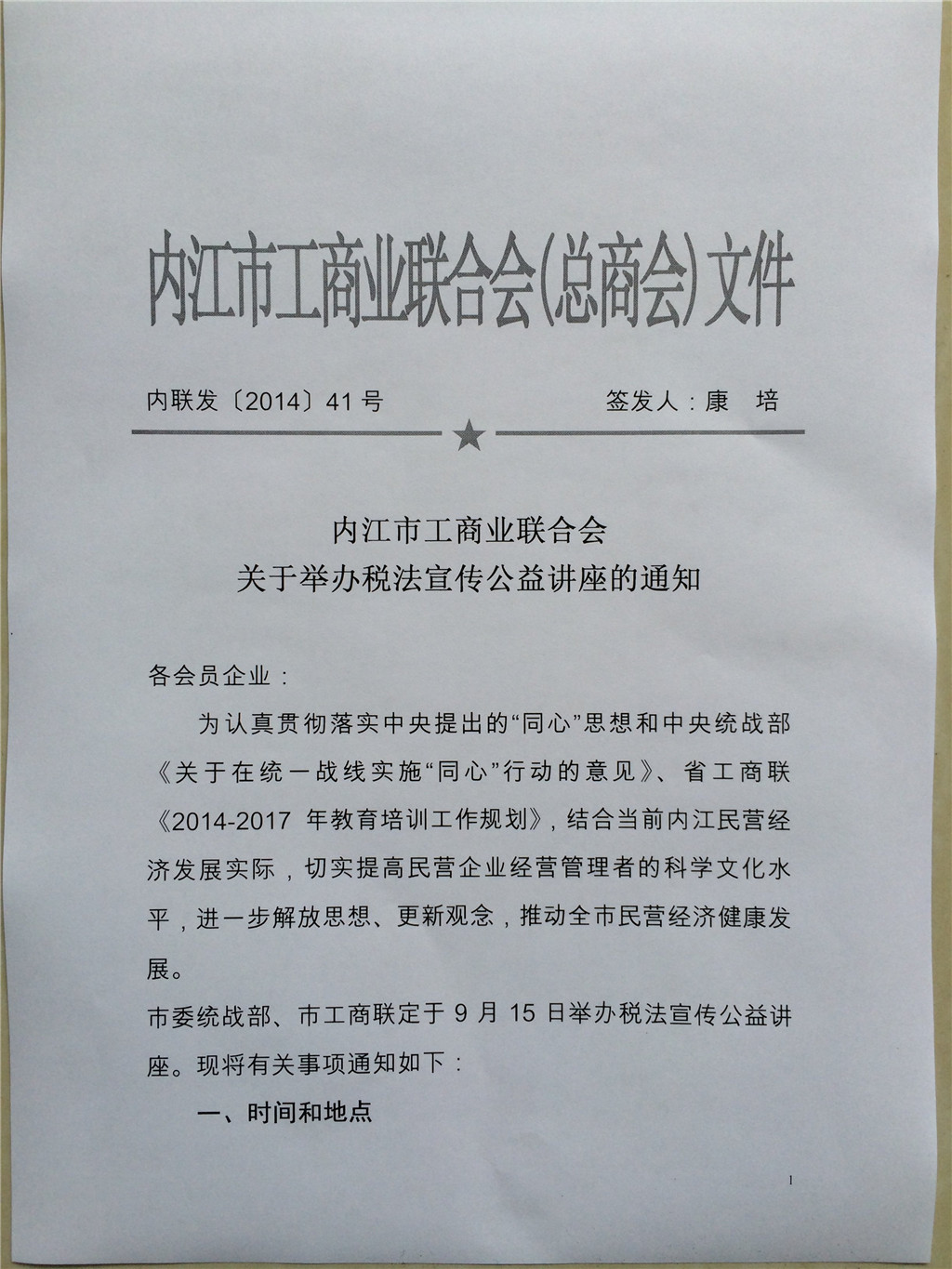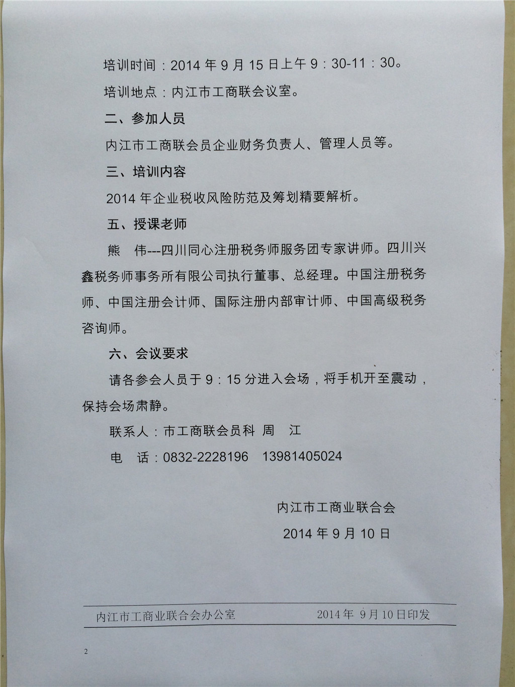 9月15日上午,由市委統(tǒng)戰(zhàn)部、市工商聯(lián)聯(lián)合主辦、四川同心注冊稅務師服務團內江分團承辦的“稅法宣傳公益講座”在市工商聯(lián)會議室舉行。特邀請四川同心注冊稅務師服務團專家講師,四川興鑫稅務師事務所有限公司執(zhí)行董事、總經理,中國注冊稅務師、中國注冊會計師、國際注冊內部審計師、中國******稅務咨詢師熊偉作了“2014年企業(yè)涉稅風險防范籌劃精要解析”專題講座。市工商聯(lián)會員企業(yè)的管理人員參加了學習培訓。